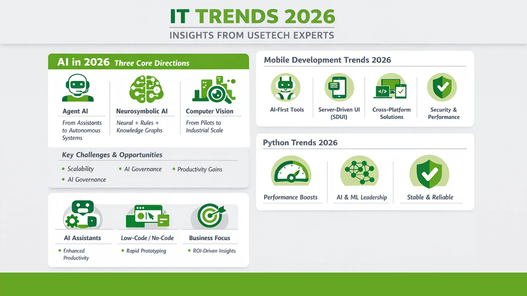 As we approach 2026, the IT landscape continues to evolve at an unprecedented pace. We asked Usetech experts to share their perspective on the key trends shaping the year ahead, and here’s a comprehensive look at what’s coming. From AI to mobile development, analytics, and Python, these trends are set to redefine how organizations operate, innovate, and stay competitive.